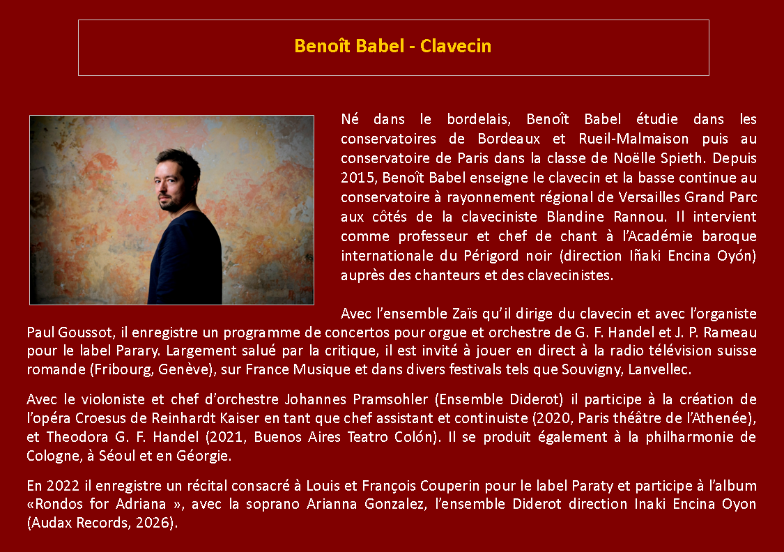 Dimanche 7 juin 2026 à 16h30 - Église Saint-Orien de Meslay-le-Grenet Festival 2026 Récital de clavecin Benoît Babel - Clavecin - Biographie Programme : , Georg-Friedrich Haendel, Henry Purcell, Jean-Sébastien Bach, Domenico Scarlatti |
