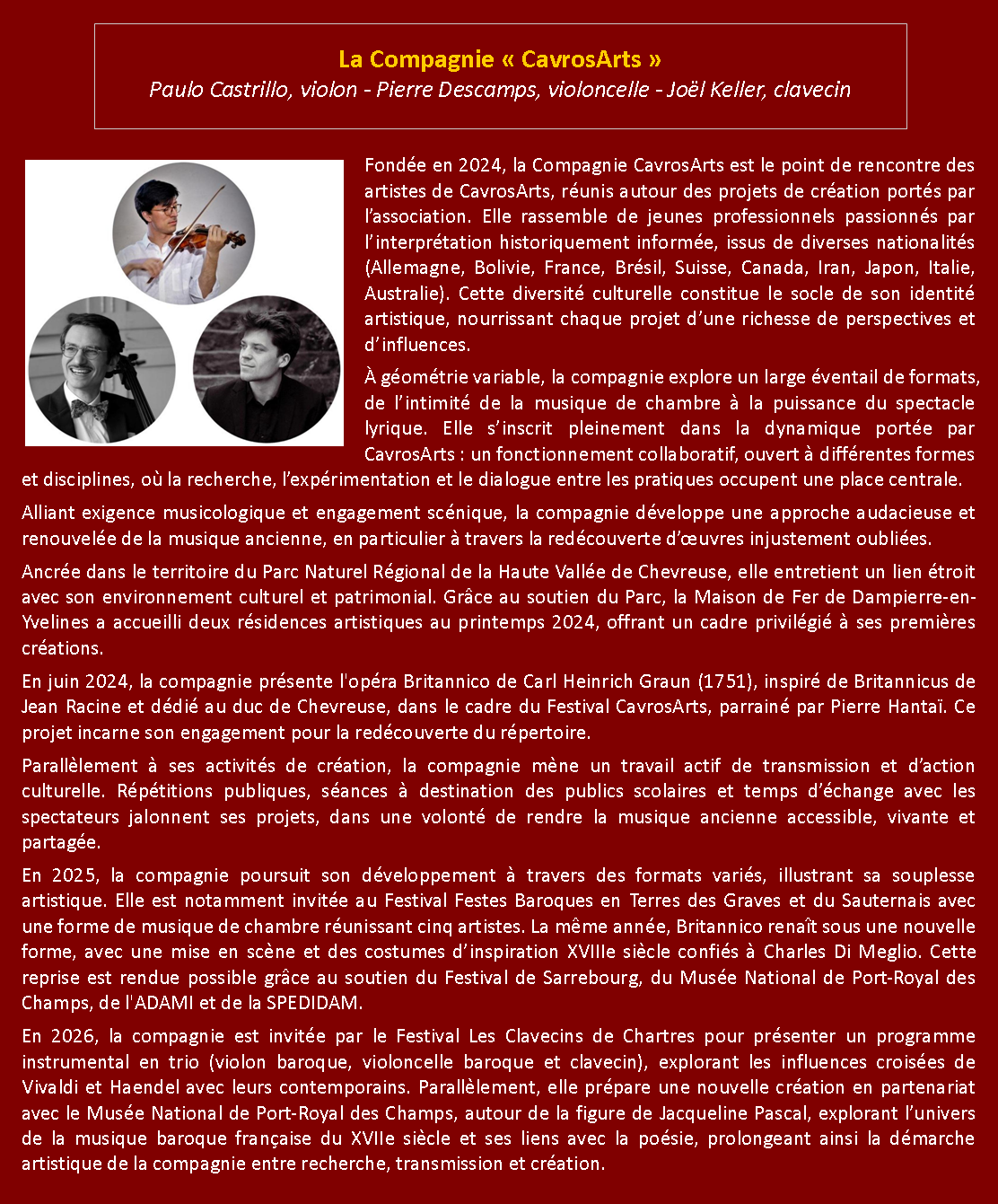 Samedi 6 juin 2026 à 20h - Église Notre-Dame de Berchères-les-Pierres Festival 2026 "De Londres à Venise" Compagnie « CavrosArts » Biographie Violon, violoncelle et clavecin Paulo Castrillo, violon Pierre Descamps, violoncelle Joël Keller, clavecin Georg Friedrich Haendel, Antonio Vivaldi, Jean-Sébastien Bach, Antonio Caldara, Francesco Maria Veracini |