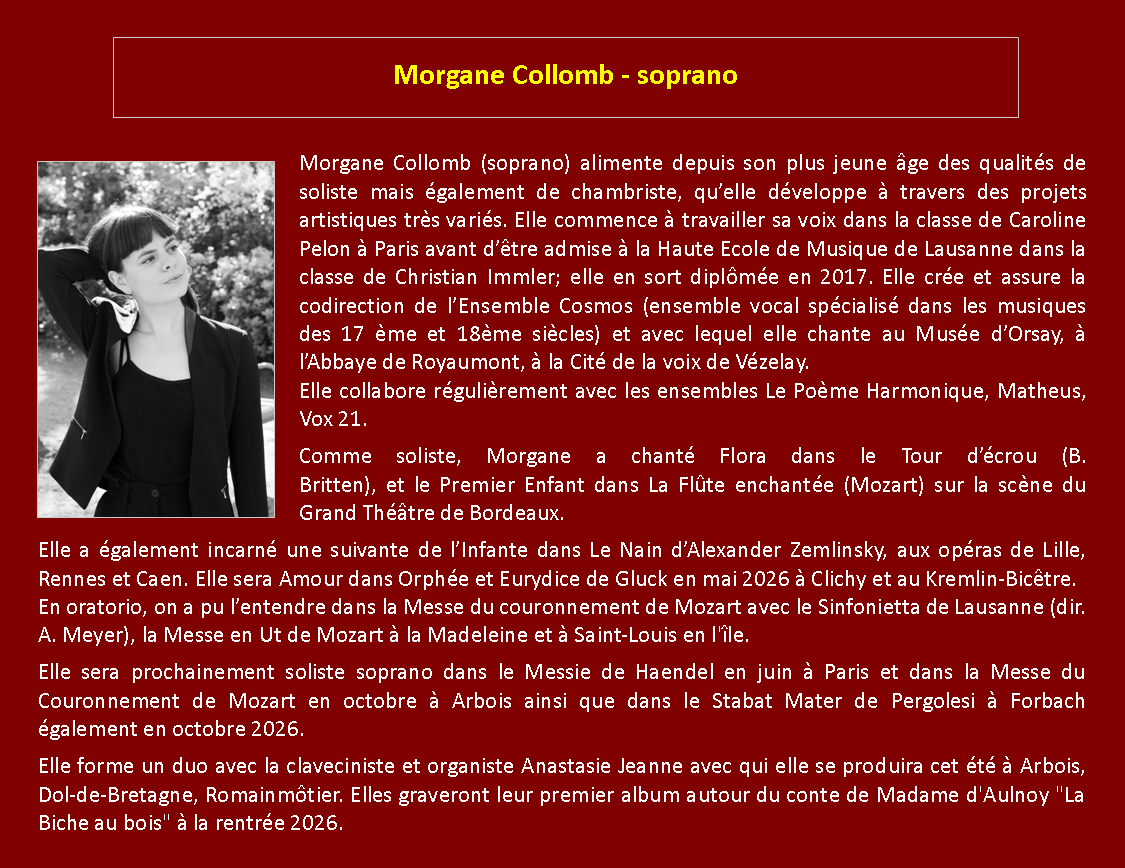 Samedi 9 mai 2026 à 20h - Église Saint-Aignan de Chartres Festival 2026 Solistes, choeur et orchestre Antonio Vivaldi - Gloria RV 589 Les Quatre Saisons - L'été RV 315 Jean-Sébastien Bach Motet BWV 230 BWV 158 "Lobet den Herrn" Georg Friedrich Haendel Concerto Grosso Opus 3 n°3 - HWV 314 Morgane Collomb - soprano - Biographie